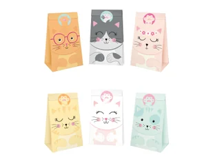 Papierowe torebki prezentowe z kotami. Pasują do zestawu Kotki. W skład zestawu wchodzi: 6 torebek (mix) oraz 6 naklejek z łapką kota. Wymiary: szer. 11 cm x wys.