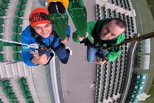 Stańcie się super bohaterami własnej rzeczywistości i obszyjcie błękit przestworzy krzykiem naszpikowanym adrenaliną. Skok wahadłowy to szczyt ludzkiej kreatywności, genialny w swojej prostocie i otwierający umysł na bodźce, których nie sposób zaznać w żadnych innych okolicznościach. Swing Jump to innowacyjna technika aktywności wysokościowych, w których uczestnik przymocowany do specjalnej ramki wykonuje skok wahadłowy, po którym ciało huśta się niczym gigantyczna huśtawka Skok wykonany w tym samym momencie wiąże relacje niczym międzyludzkie spoiwo, a możliwość podzielenia się własnymi wrażeniami z ukochaną osobą oraz sam fakt jej obecności - pokrzepiają ducha i powiększają serce, które ugrzęzło w koleinach codziennych zmartwień.