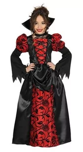87394Szczegóły: Ten kostium wampirzej hrabiny jest przeznaczony dla dziewczynek. Składa się z sukienki i kołnierza. Sukienka wykonana jest z czarnego i czerwonego satynowego materiału, z pięknymi czarnymi figurami na czerwonej części. Ma długie rękawy.