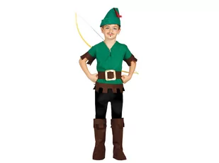 Strój Robin Hooda dla chłopca. W komplecie: bluzka z pasem, spodnie, czapka i nakładki na buty. Rozmiar: 5-6 lat (110-115 cm).