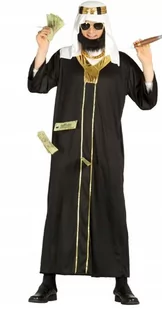 Kostium Araba, Szejka, Muzułmanina - Króla Ropy to zestaw, na który składa się długa czarna szata arabska, zdobiona złotymi elementami oraz charakterystyczne białe nakrycie głowy. Poczuj się jak zamożny książe z dubaju, zaszalej na imprezie tematycznej lub karnawałowej.