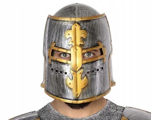 HEŁM Z PRZYŁBICĄ RYCERSKI STRÓJ RYCERZA SREBRNO ZŁOTY ŚREDNIOWIECZE Rozmiar uniwersalny dla dorosłych Malowanie w kolorze srebrnym ze złotymi wstawkami Przód...