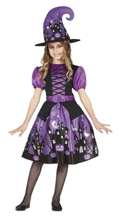 W pasie od przodu czarny mini fartuszek, z tyłu wszyta gumka, dla lepszego dopasowania do figury. Sukienka posiada zapięcie na rzep na karku. Przebranie dopełnia charakterystyczny czarny szpiczasty kapelusz wiedźmy. Nakrycie głowy także we fioletowym kolorze z halloweenowym nadrukiem jak na spódnicy. Idealne przebranie dla wiedźmy czy czarownicy na Halloween, ale także baba jagi na balik postaci z bajki.