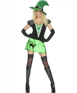 W pasie wszyte tasiemki do regulacji obwodu, dzięki którym sukienkę można ładnie dopasować do figury. Kapelusz w charakterystycznym szpiczastym stylu z lekko zawiniętą końcówką. Nakrycie głowy jest zielone, połyskujące z nadrukiem czarnych pajęczyn. Dodatkowo ozdobione połyskującą czarną taśmą na obwodzie ze srebrną plastikową klamrą. Przebranie dopełniają długie welurowe pięciopalczaste rękawiczki.