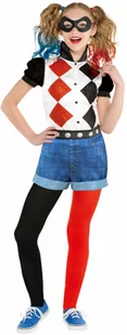 satynowa koszulka, szorty z legginsami, pasek, maska na oczy - Zestaw kostiumów na imprezy tematyczne, karnawał i cosplay Ten licencjonowany zestaw kostiumów zmieni Twoją córkę w uroczą, szaloną Harley Quinn. Zestaw zawiera satynową koszulkę z brokatowym nadrukiem, szorty z czarno-czerwonymi legginsami, odpinany pasek i maskę na oczy. Aby uzupełnić wygląd superbohaterki, zalecamy połączenie kostiumu z dwoma warkoczami lub peruką. Kostiumy DC Super Heroes są idealne jako kostiumy grupowe, ponieważ można wybierać spośród wielu różnych postaci i rozmiarów. Kostium dziecięcy odpowiedni dla dzieci o wzroście 128-140 cm.
