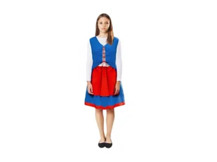 Strój Kujawianki. W komplecie: niebieska kamizelka oraz spódniczka z czerwonym fartuszkiem. Rozmiar: 122/128 cm. Wykonany ze stretchu.