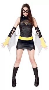 Seksowna sukienka w czarnym kolorze z żółtymi dodatkami. Przenikliwy wygląd przebranie karnawałowe nabiera dzięki wycięciu na piersiach w kształcie nietoperza oraz niespotykane rękawy połączone z sukienką siateczką. Batmanka zawiera również maskę, pasek oraz nakładki na buty. Przemień się w postać Dziewczyny Batman. opis/rozmiar XS-S M sukienka: