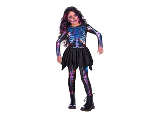 W komplecie: kombinezon z nadrukiem neonowych kości oraz przyszytą czarną spódniczką.