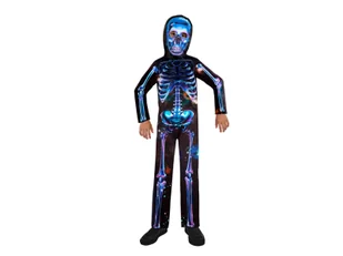 W komplecie: kombinezon z nadrukiem neonowych kości, kaptur na głowę z nadrukiem czaszki.