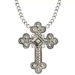 Krzyż biskupa. Kolor: srebrny. Na łańcuszku. Bogato zdobiony.