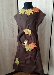 - w górnej części – 3 liście - w środkowej części – imitacja dziupli z wiewiórką i żołędziami - na całości imitacja kory drzewa Do każdego stroju dodatkowo dołączamy 3 spinki – liście klonu w trzech różnych kolorach Stroje wykonywane ręcznie, według własnego projektu.
