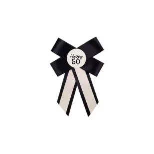Kotylion na 50 urodziny w kolorze kremowo-czarnym, wymiary ok. 11 x 17 cm. Kotylion wyposażony jest w agrafkę.