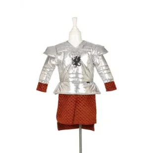 Kostium gladiatora Murmillo holenderskiej marki Souza! to przepiękne przebranie dla chłopca. Srebrna zbroja ma czarną aplikacją gryfa na piersi, pikowania imitujące metaliczne zgrzewy i nity oraz rozbudowane naramienniki. W wydłużonej dolnej części, a także przy makietach znajduje się fakturowany rdzawo-czerwony materiał. Kostium wkładany jest przez głowę i zapinany z tyłu na solidny rzep. Co go wyróżnia: