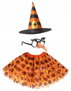 W skład zestawu wchodzą: kapelusz z nadrukiem klamry i pomarańczowych pasków spódniczka z diodkami LED okulary z nosem czarownicy Szczegóły zestawu: Spódnicz...