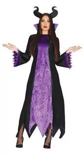 Strój Czarownica z rogami Zestaw zawiera: sukienkę opaska na głowę sukienka z długim rękawem w kolorze czarno-fioletowym. , wciągana przez głowę kołnierz usztywniany, zapinany na rzep rękawy i dół sukienki poszarpane. opaska z rogami w kolorze czarnym elastyczna i lekka, nie uciska głowy