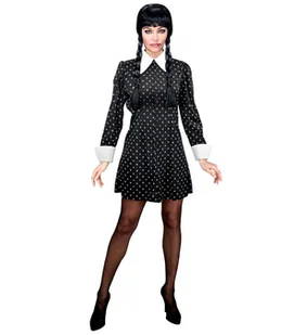 Sukienka w kolorze czarnym, z długim rękawem. Posiada ozdobny biały kołnierzyk oraz białe mankiety. Zapinana w przodzie na guziki. Produkt ozdobiony białym, ...