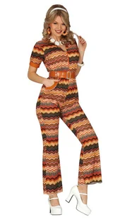 Kombinezon w stylu lat 70-tych. Nadruk: kolorowy wzór. Pasek z klamrą. Strój zapinany z przodu na zamek. Skład: 100% poliester.