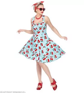 Strój dla dorosłych, Disco lata 50-te, rozmiar M strój dla dorosłych, Disco lata 50-te sukienka lekko rozkloszowana, na szerokich ramiączkach skrzyżowanych na plecach pod pachami wszyta elastyczna gumka kolor niebieski z czerwonymi wisienkami rozmiar: M
