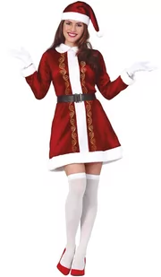 Przebranie świąteczne Strój dla kobiet w formie Pani Mikołajki. Zestaw zawiera bordową sukienkę, czapkę i pasek. Rozmiar L (42-44): Klatka piersiowa obwód: 99,5-103 cm Obwód w pasie: 80-84 cm Obwód w biodrach: 106-110 cm