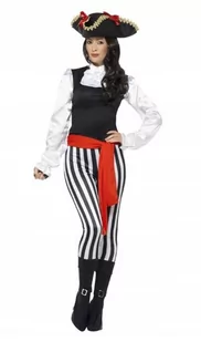 Strój dla dorosłych, Pani Rozbójnik, rozmiar L strój dla dorosłych, Pani Rozbójnik w komplecie znajduje się: bluzkę, spodnie, kołnierz, szarfę czarna bluzka z długim białym rękawem ze ściągaczem spodnie na gumce, w czarno-białe pionowe paski posiadają doszyte nakładki na buty mocowane na gumce kołnierz w kolorze białym, wiązany z tyłu szarfa w kolorze czerwonym do przewiązania rozmiar: L