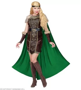 strój dla dorosłych, Pani Wiking zestaw zawiera: sukienkę, ocieplacze, opaskę, pasek sukienka w kolorze brązowym zdobiona szerokim pasem oraz złotym wzorem do sukienki doszyto pelerynę w kolorze niebieskim oraz futerko opaska brązowa ze złotym wzorem ocieplacze na nadgarstki w kolorze brązowym z futerkiem pasek czarny ze złotym wzorem rozmiar: S