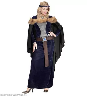 strój dla dorosłych, Średniowieczna Księżniczka w komplecie znajduje się: sukienka, pasek, opaska na włosy sukienka maxi w kolorze granatowym, z wszytą peleryną oraz doszytym kawałkiem futra na ramionach posiada długie rękawy, jest odcięta w pasie opaska granatowa ozdobiona srebrną wstążką, mocowana na gumce pasek brązowy, wiązany rozmiar: M