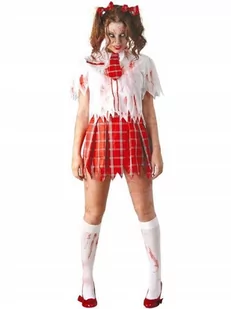 bluzka koloru białego, zapinana na guziczki całość posiada plamy ze sztucznej krwi spódniczka z gumką w pasie czerwona, w biało-czarną kratkę krawat na gumce, wykonany z tego samego materiału co spódniczka gumki posiadają kokardki z tego samego materiału co spódniczka i krawat W zestawie znajduje się: bluzkę spódniczkę krawat 2 gumki