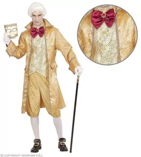 strój dla dorosłych, Wenecki Szlachcic w zestawie znajdują się: frak z kamizelką, spodnie miodowy frak z wszytą kamizelką, ozdobioną złotym wzorem i guzikami przy szyi doszyta czerwona kokarda z broszką miodowe spodnie na gumce w pasie rozmiar: S