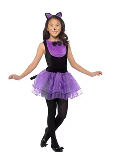 strój dla dzieci, kotek tutu zestaw zawiera: sukienkę, opaskę sukienka bez rękawów w kolorze fioletu i czerni góra sukienki posiada doszyta czarna kokardkę dół składa się z kilku warstw tiulu zakończonego czarna lamówką z tyłu doczepiony czarny koci ogon opaska wykonana z tworzywa sztucznego w kolorze czarnym, z uszkami z fioletowymi wstawkami rozmiar: 128