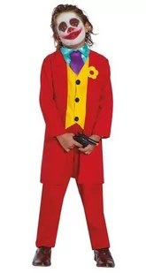 strój dla dzieci, pan uśmiech zestaw zawiera: kołnierzyk, marynarkę, spodnie kołnierzyk niebieski z krawatem, zapinany na rzep marynarka czerwona z wszytą żółtą kamizelką, zapinaną na rzep spodnie czerwone, mocowane na gumce w pasie rozmiar: 128