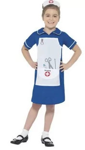 strój dla dzieci, pielęgniarka zestaw zawiera: sukienkę, czepek granatowa sukienka z krótkim rękawkiem i kołnierzykiem, zapinana z tyłu na rzep, z naszytym białym fartuszkiem fartuszek ozdobiony jest nadrukami przyborów i narzędzi lekarskich do zestawu dołączono czepek mocowany na gumce rozmiar: 146