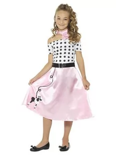 strój dla dzieci, pin-up lata 50 zestaw zawiera: sukienkę, chustę, pasek sukienka wykonana z imitacji atłasu w kolorze różowo-białym, posiada nadruk pieska, posiada dołączone przezroczyste ramionka do doczepienia chustka w formie chokera, mocowana za pomocą rzepu pasek czarny, zapinany na rzep rozmiar: 146