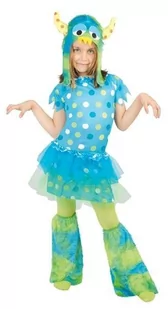strój dla dzieci, potworek monster zestaw zawiera: sukienkę, czapeczkę sukienka koloru niebieskiego z elementami zielonego i białego, zdobiona wzorem w groszki oraz niebieskim i zielonym tiulem na spódniczce, rękawki sukienki poszarpane kolorowa czapka potworka wykonana z materiału przypominającego plusz (materiał "włochaty"), zapinana pod brodą na rzep rozmiar: 116