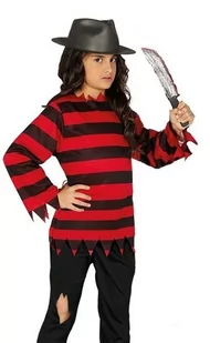 strój dla dzieci, zabójca zestaw zawiera: bluzkę, spodnie bluzka w czarne i czerwone paski, z długimi rękawami wyciętymi w trójkąty dół i góra bluzki również wycięta spodnie w kolorze czarnym z dziurą na wysokości kolana oraz wycięte w trójkąty na dole nogawek rozmiar: 146