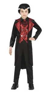 Zestaw zawiera: płaszcz, kamizelkę, fragment koszuli z muszką. Strój w kolorze czarno-bordowym. Płaszcz wykonany z materiału przypominającego welur. Kamizelka zapinana na rzepy, z ozdobnymi guzikami.