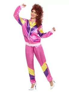 STRÓJ DRES RÓŻOWY LATA 80; W komplecie znajdują się: - bluza, - spodnie. Kolor: różowy; z elementami fioletu,żółci i bieli. Strój wykonany jest z poliestru imitujacego ortalion. Strój wysokiej jakości.