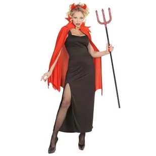 Zestaw zawiera: -sukienkę, -pelerynę, -opaskę na głowę. Kolory: czarny, czerwony. Długa sukienka na ramiączkach. Peleryna z poszarpaniami i usztywnianym kołnierzem Opaska rogi diabła. Skład: 100% poliester.