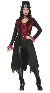 Czarny płaszcz z wszytą kamizelką. Kamizelka w kolorze czerwonym, zapinana na trzy guziki. Rękawy zakończone czerwoną koronką. Płaszcz zakończony jest trójkątnym cięciem. STRÓJ NIE ZAWIERA NASZYJNIKA Skład: 100% poliester.
