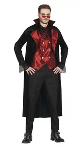 Zestaw zawiera: płaszcz, kamizelkę, fragment koszuli z muszką. Strój w kolorze czarno-bordowym. Płaszcz wykonany z materiału przypominającego welur. Kamizelka zapinana na rzepy, z ozdobnymi guzikami.