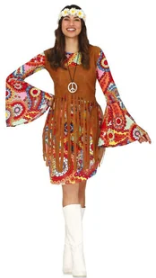 Kolorowa sukienka z brązową kamizelką. Rękawy długie, rozkloszowane. Skład: 100% poliester.