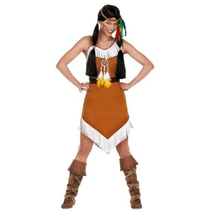 Zestaw zawiera: sukienkę, opaskę. Strój indianki w kolorze brązowym. Zdobiony białymi frędzlami. W pasie czarny pasek. Opaska w odcieniach brązu zdobiona kol...