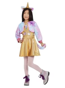 Zestaw zawiera: top spódniczkę kurtkę opaskę ogon Kurtka z kolorowego futerka z różowym ściągaczem. Spódniczka oraz top ze złotego, holograficznego materiału. W pasie wszyta gumka. Kolorowy ogon przypinany na rzep.
