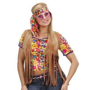 Zestaw zawiera: kamizelkę, opaskę. Kamizelka hipiski w kolorze brązowym. Wykończona frędzlami. Opaska materiałowa w kwiaty. Uwaga: koszula, okulary oraz pacy...