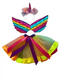 Rozmiar uniwersalny dla wieku 4-7 lat. Spódniczka ma długość 30 cm, a szerokość w pasie 2x25 cm, rozciągając się do 2x35 cm. Spódniczka bez halki lekko prześwituje. Skrzydełka montowane na dwie gumeczki zakładamy jak plecak wielkość skrzydeł 45x25 STRÓJ KOSTIUM KARNAWAŁOWY UNICORN TUTU Marka inna marka Strój wysyłam na płasko odpowiednio zabezpieczony do wysyłki. Estetycznie będzie wyglądał po wyprasowaniu parowym.