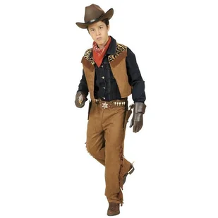 Zestaw zawiera: kamizelkę, spodnie. Kamizelka wykonana z lekkiego materiału, z przodu ozdobiona materiałem w brązowe łaty z frędzlami. Spodnie brązowe na gum...