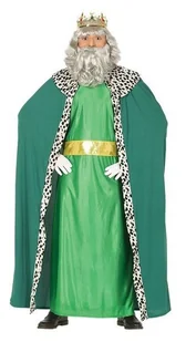 Zestaw zawiera: tunikę pelerynę pasek. Strój oraz peleryna w kolorze zielonym, dopinana na rzep. Pasek w kolorze złotym. Korona, peruka z brodą oraz rękawicz...