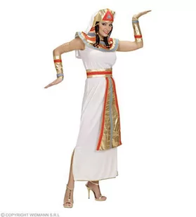 STRÓJ KRÓLOWA NILU KLEOPATRA; Zestaw zawiera: sukienkę bransoletki czapkę pasek. Strój w kolorze białym zdobiony złoto-czerwono-niebieskimi dodatkami.