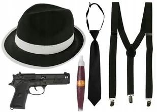W skład zestawu wchodzą: czarny kapelusz z białą wstążką - obwód ok 58cm szelki czarne, regulowane o grubości gumy 2,5cm krawat czarny na gumce o wymiarach 4...