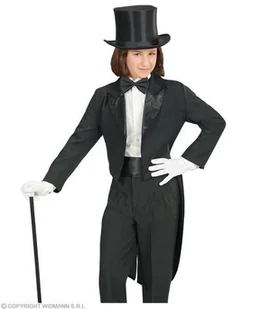 Strój mały dżentelmen - 128 STRÓJ MAŁY DŻENTELMEN; Czarny frak z długim rękawem. Zapinany z przodu na guzik. Długość: - przód ok. 39cm. - tył ok. 92 cm.