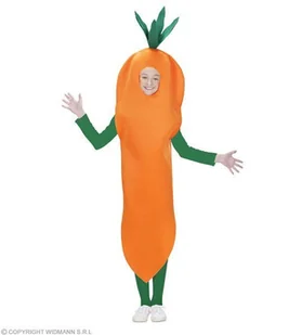 STRÓJ MARCHEWKA; Kolor pomarańczowo-zielony. Strój marchewki wykonany z miękkiego materiału w kolorze pomarańczowym. Przód wycięty w szpic jak korzeń marchwi...